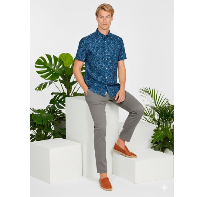 Refresca tu estilo con esta camisa de manga corta y estampado floral en tonos azules. Su diseño vibrante y moderno la convierte en una prenda ideal para los días más cálidos, aportando personalidad y frescura a cualquier look.