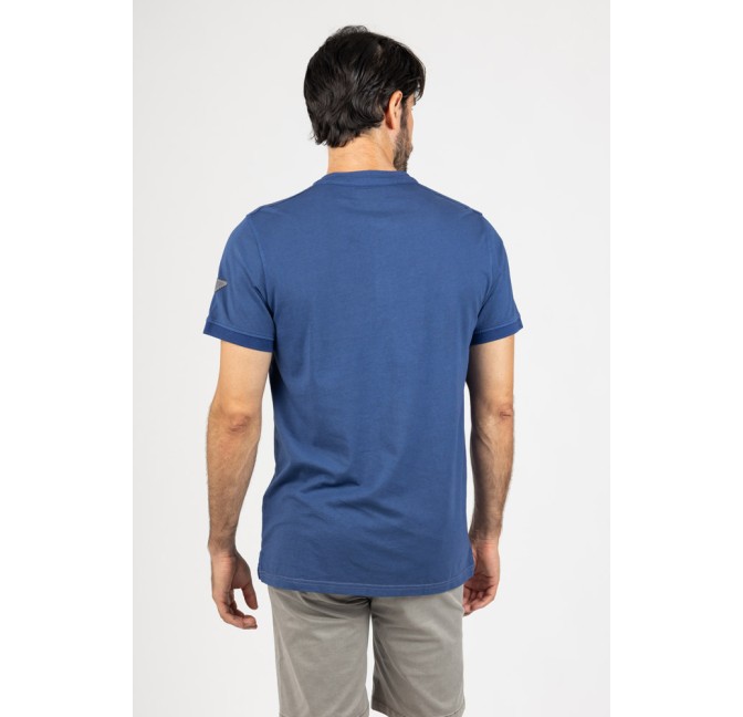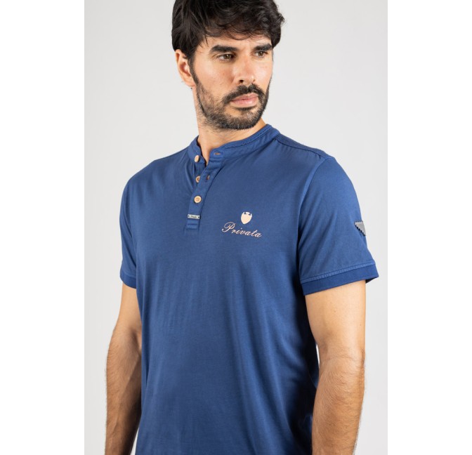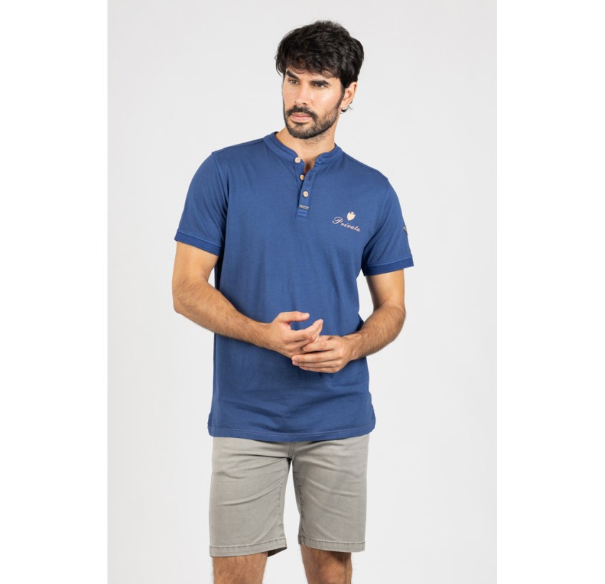 Camiseta en tono azul con diseño de cuello mao y tapeta de botones, una opción diferente que aporta un estilo moderno y desenfadado.