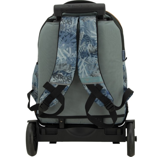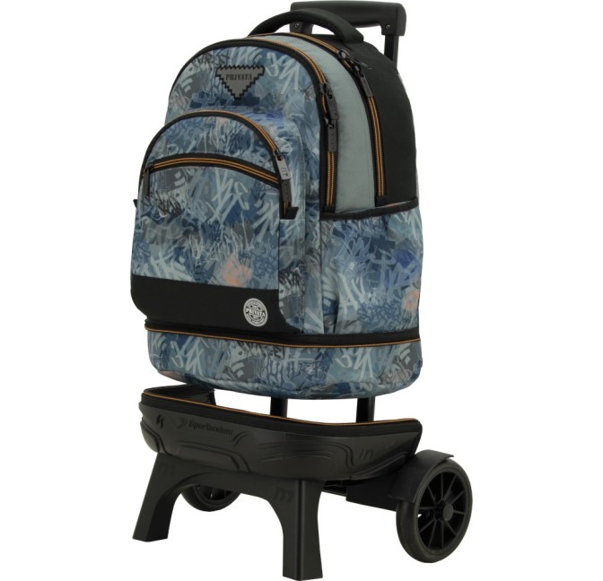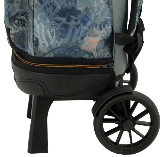 2 usos en 1: el uso de Carro fijo de base resistente. Con dos ruedas grandes y silenciosas para lograr un mejor movimiento y estabilidad. La posición e inclinación de sus dos patas delanteras evitan el volcamiento del carro y el otro uso de solo mochila, pues se puede separar del carro a través de la cremallera que los une. Tiene dos compartimientos amplios y un bolsillo frontal con un organizador interno. Tirantes ergonómicos de espuma transpirable con velcro al final que se adhieren al espaldar para que no se arrastren por el suelo. Bolsillo en el lateral derecha para llevar una botella . Asa acolchada de agarre superior.