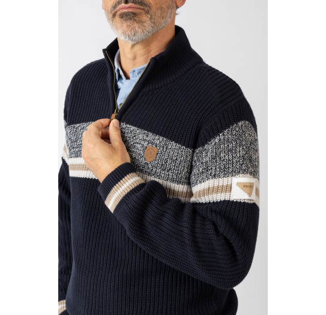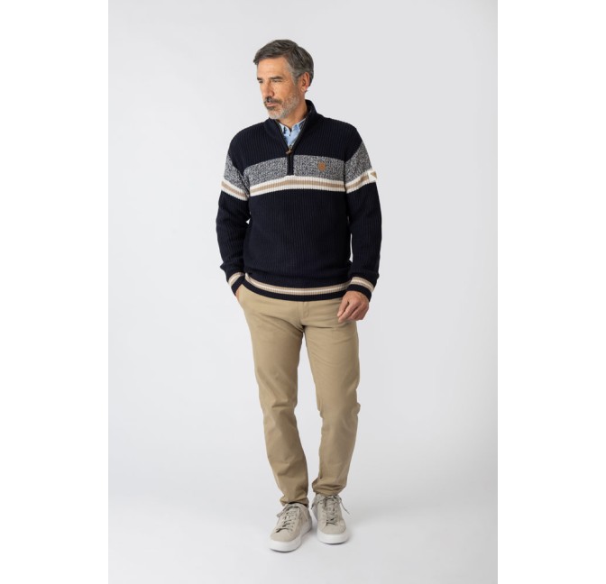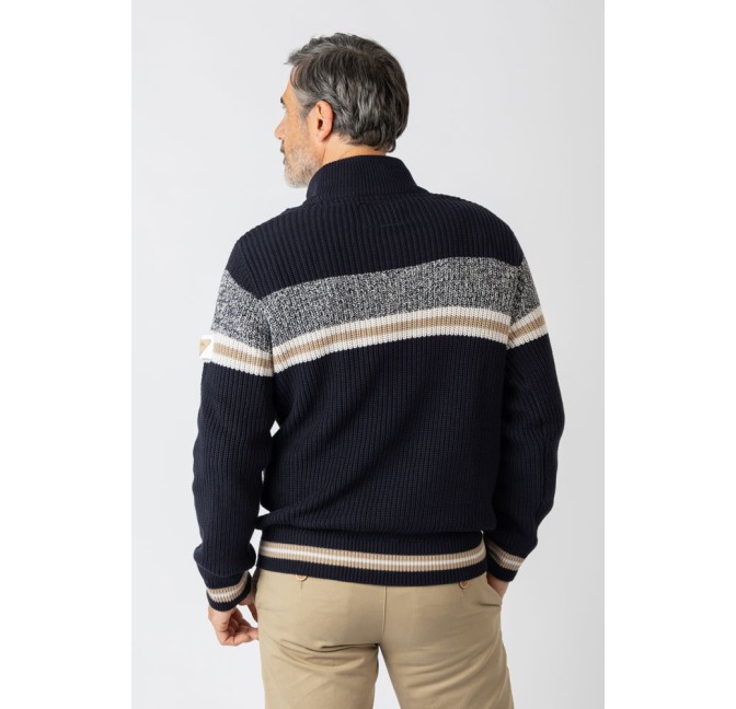 Jersey de corte recto confeccionado en suave algodón con cuello con cremallera. Diseño en combinado marino, blanco y ocre.
