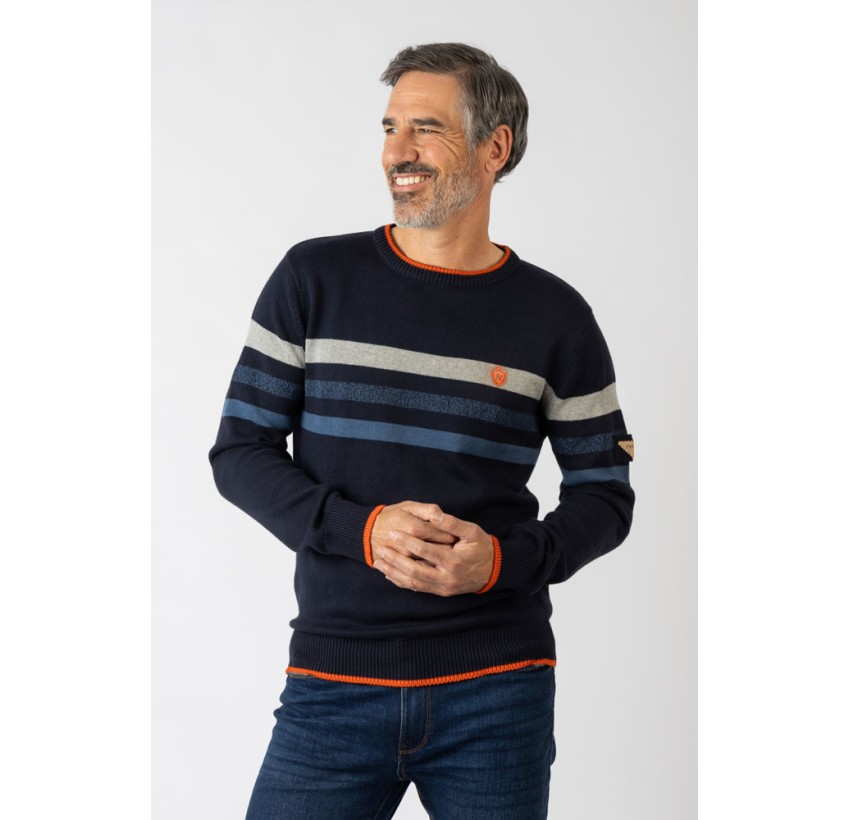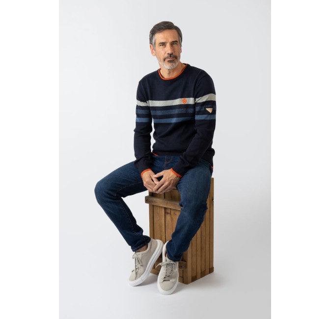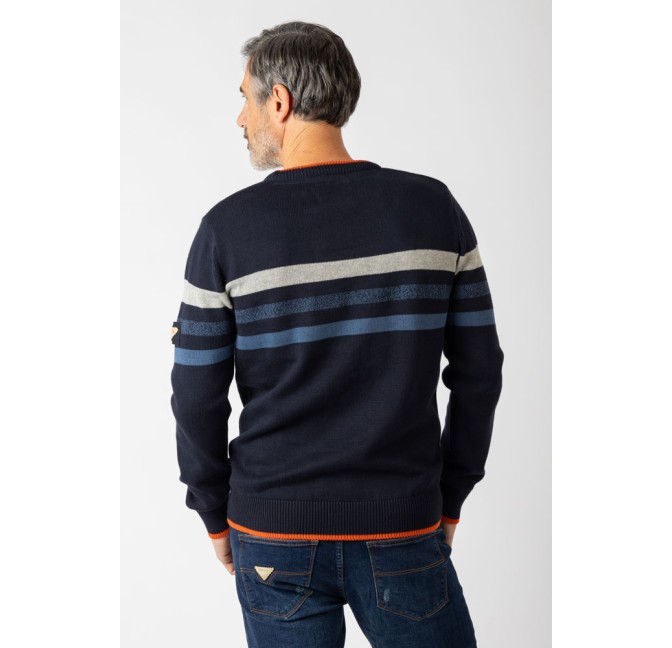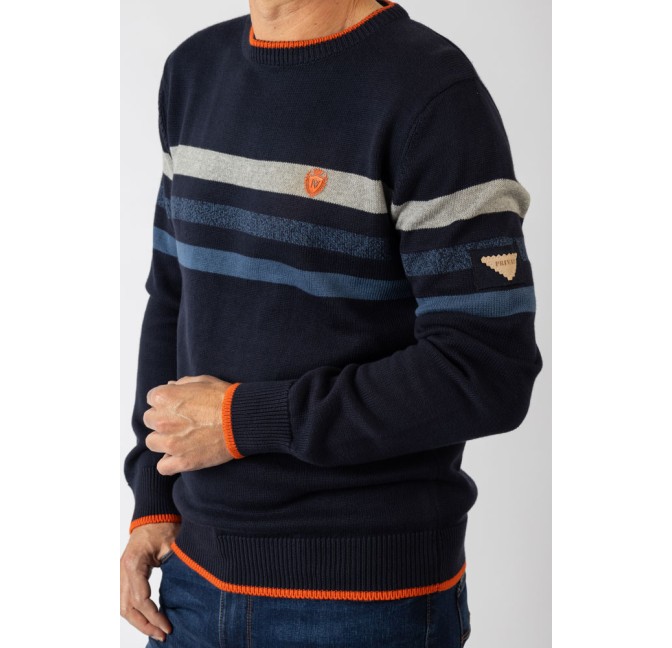 Siente el espíritu Privata con jersey cuello redondo, tejido confortable y agradable. Franjas en tres colores, logo engomado en el pecho.