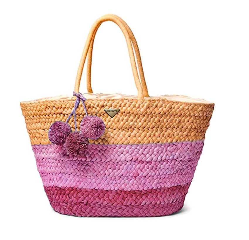 Cesta de playa en fibras vegetales con combinación de colores en rosas.
