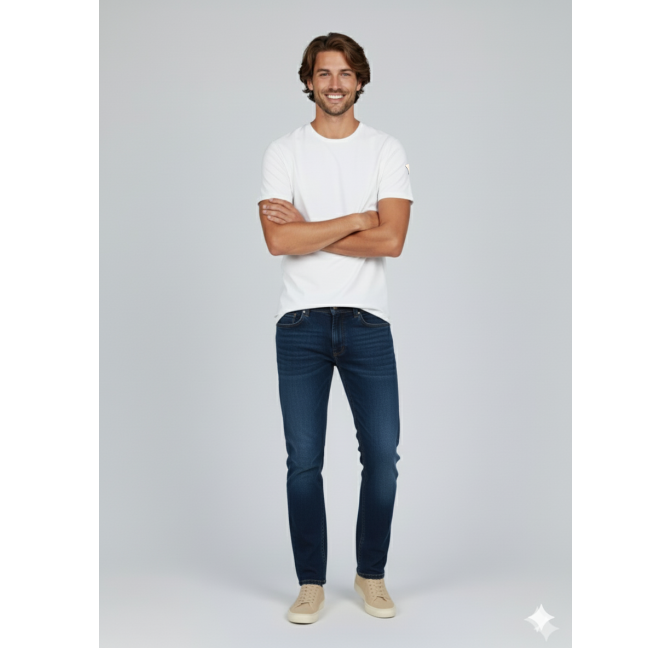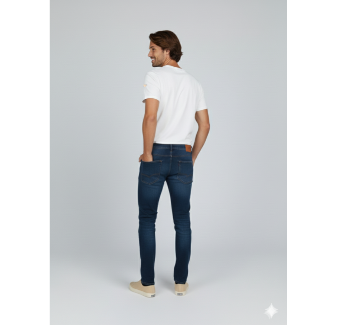 Vaquero en tono denim medio confeccionado en tejido resistente con un ligero tacto suave, ideal para un uso continuado.