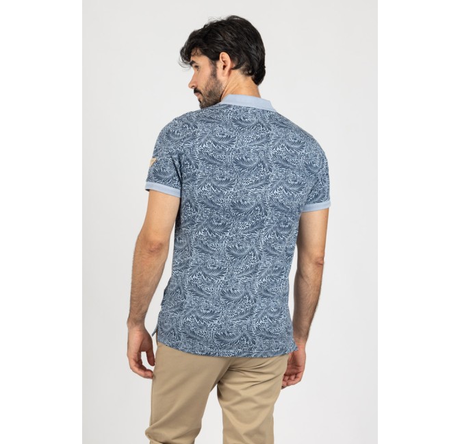 Polo en tono azul con estampado floral de inspiración tropical, perfecto para aportar un toque distintivo y elegante a tus looks de verano.