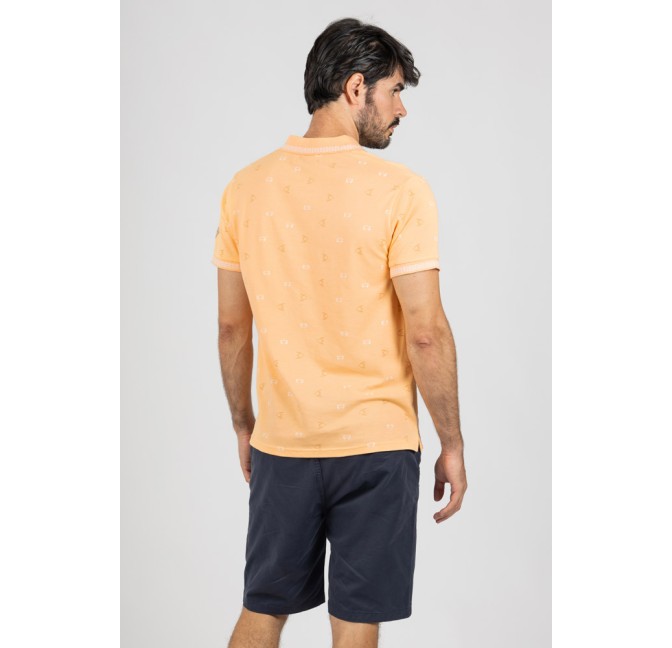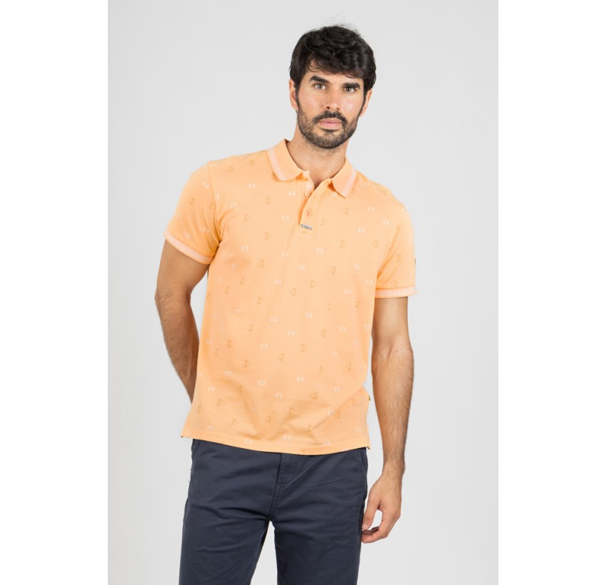 Polo en tono mandarina con micro estampado de inspiración náutica, una opción vibrante que aporta personalidad y frescura.