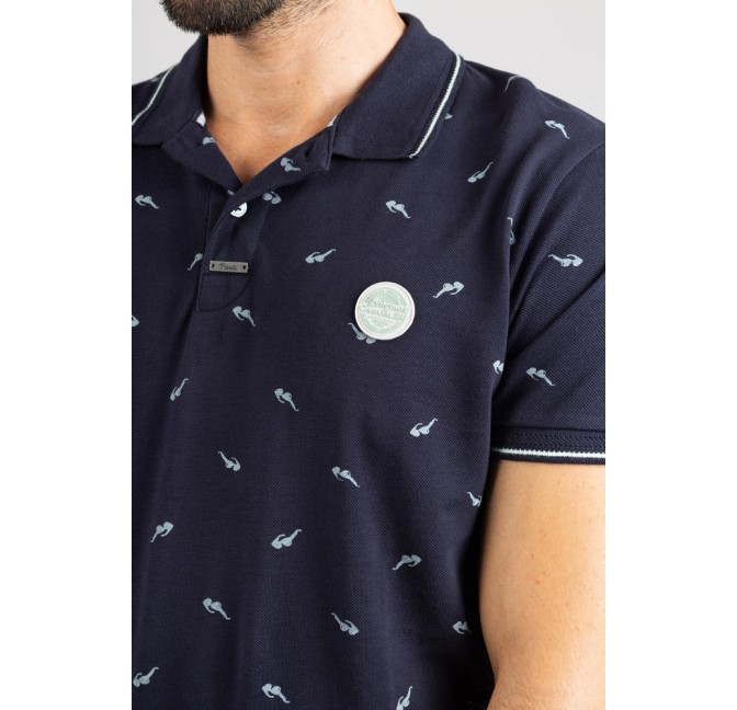 Polo en tono azul marino con micro estampado de gafas de sol, una propuesta elegante con un toque desenfadado.