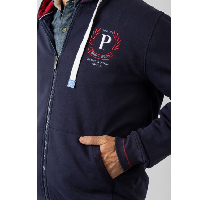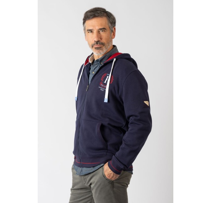 Sudadera abierta con capucha y bolsillos con tejido suave, combinación gráfica bordada en el pecho.