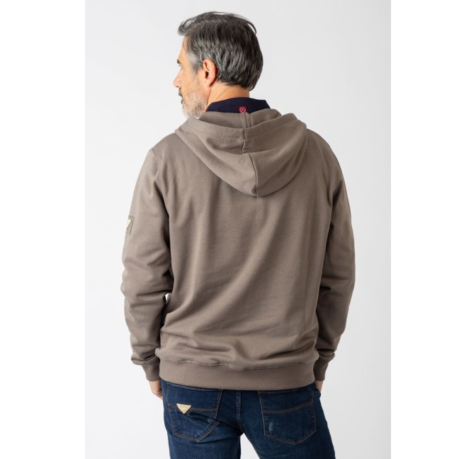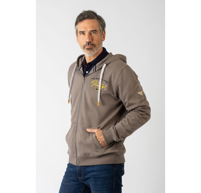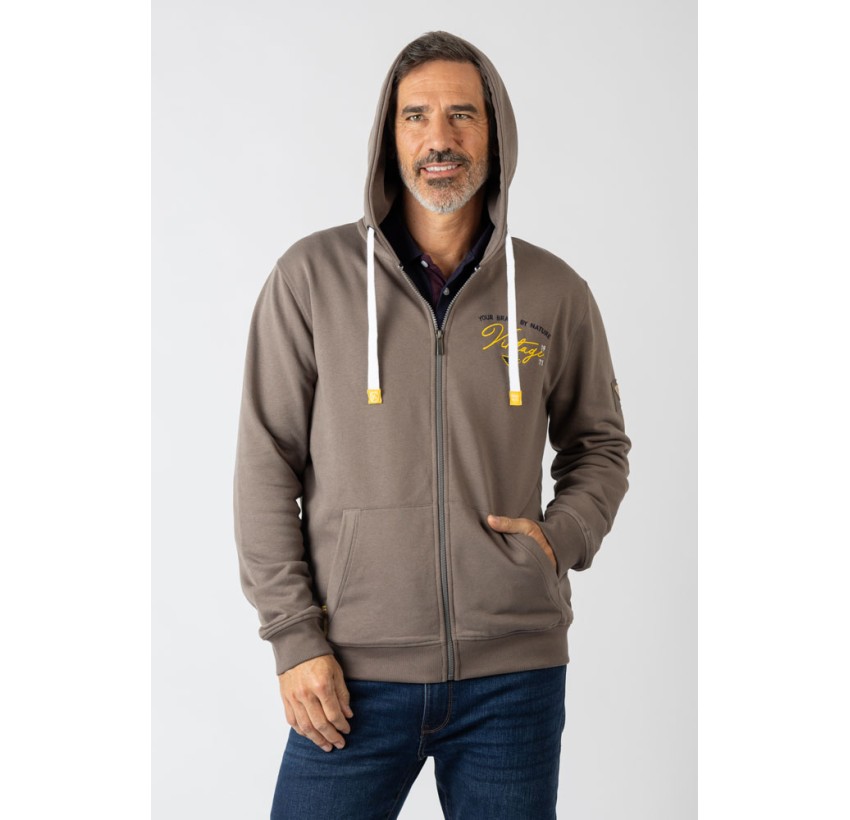 Sudadera abierta con capucha y bolsillos con tejido  suave, combinación gráfica bordada en el pecho.